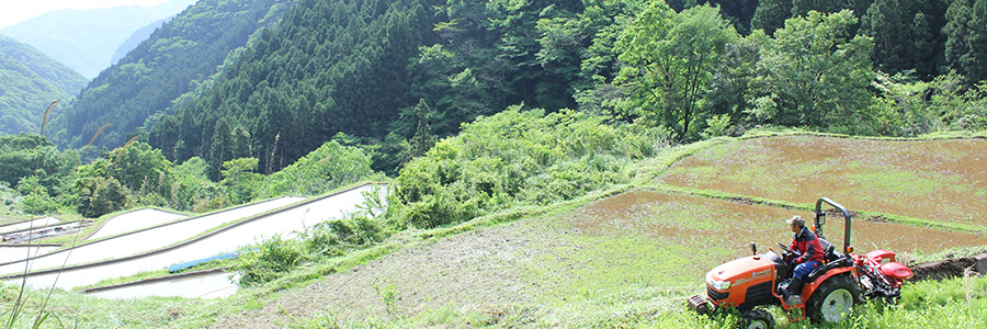 秋元ムラのはずれもはずれ。ムラ最後の民家を通り過ぎ、なんだか心細くなってきた頃にムラたび農園の棚田は現れます。標高600メートルに位置する棚田は、朝晩の寒暖差・諸塚山からの豊富な湧水・深呼吸したくなるような澄んだ空気といった、自然の恩恵を授かり、稲たちをのびのびと育てています。 代掻きした田んぼが銀板に光る春、若い苗が青空に映える夏、金色の稲穂が風にそよぐ秋。四季を通じて、雨の日も風の日も、淳志は愛する作物のためにせっせと山へ向かいます。